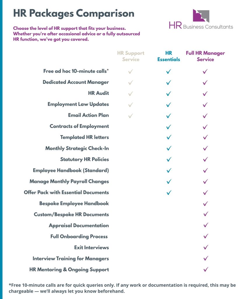 All services are available on a one-off or retained basis and can be quoted for separately, ensuring clarity and value for money. Get in touch to see how our tailored HR solutions can support your business success.